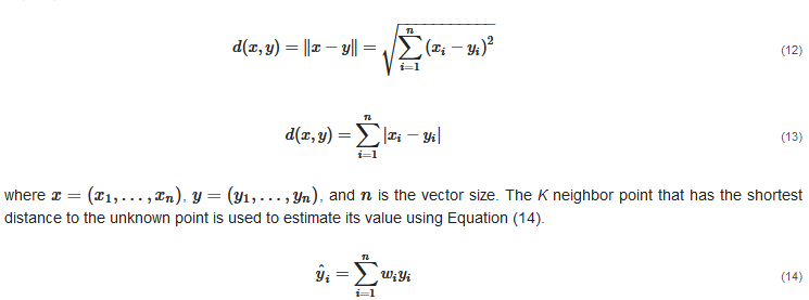 The KNN model is a statistical tool for estimating the value of an unknown point based on its nearest neighbors [69]. The nearest neighbors are usually calculated as the points with the shortest distance to the unknown point [70]. Several techniques are used to measure the distance between the neighbors. Two simple techniques are used in this study: the Euclidean distance function d(x,y), provided in Equation (12), and the Manhattan distance function d(x,y), provided in Equation (13).
