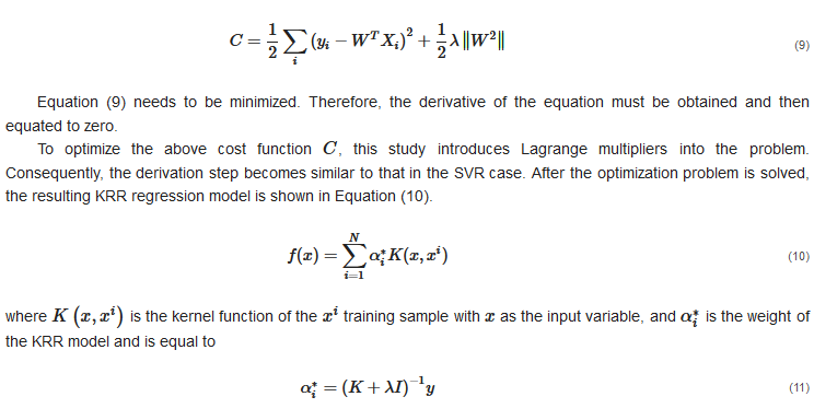 The KRR is possibly the most elementary algorithm that can be kernelized to ridge regression [31]. The classic method is used to minimize the quadratic cost, as shown in Equation (8). However, for the nonlinear dataset, the lower-dimensional feature space replaces the higher-dimensional feature space; that is, Xi→Φ(Xi). To convert lower-dimensional space to higher-dimensional space, the predictive model undergoes overfitting. Hence, to avoid overfitting, this function requires regularization.