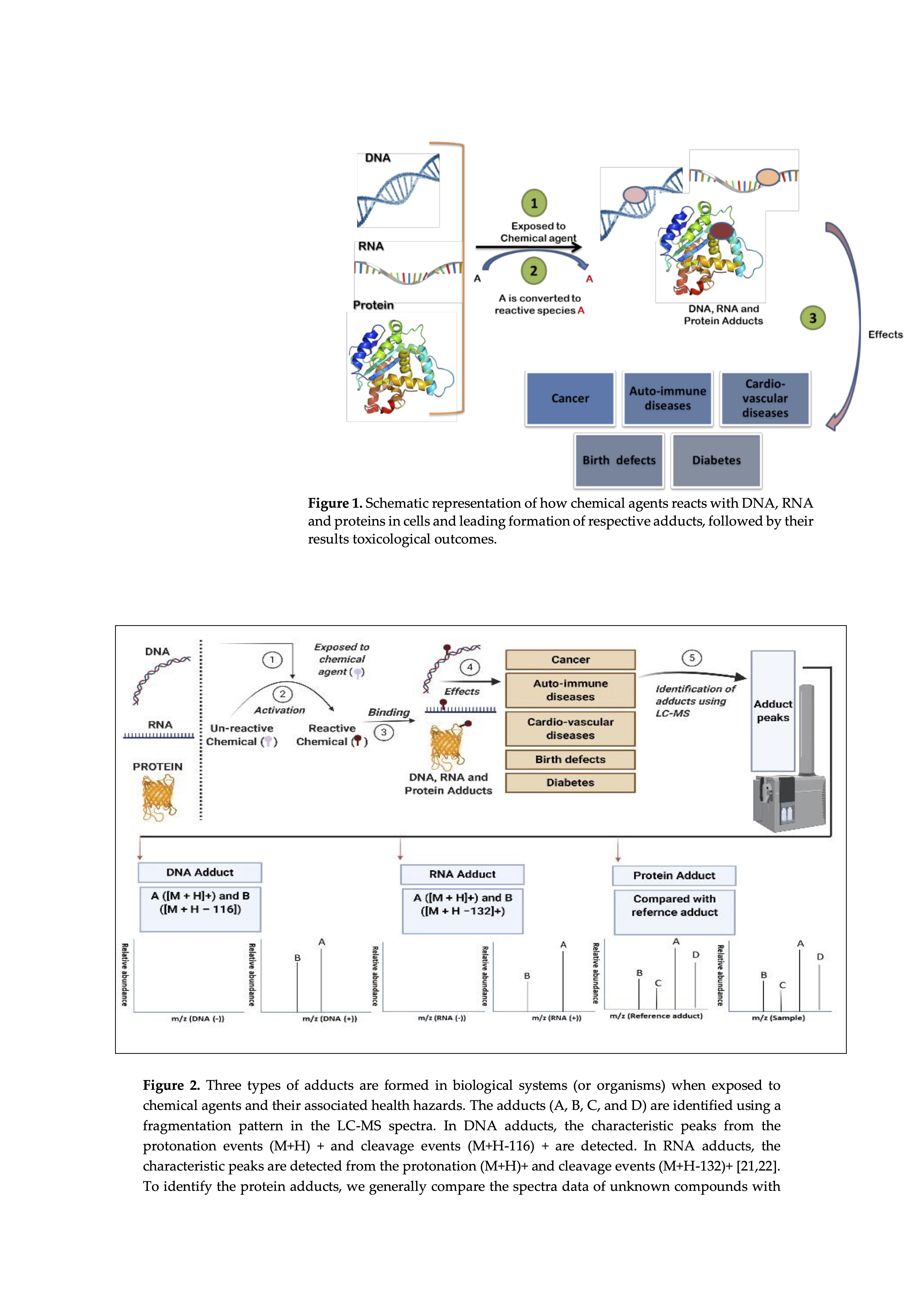 In some cases, natural chemicals do not bind directly to biological molecules, forming adducts, however, transformation into reactive metabolites occurs through metabolic enzymes such as cytochrome P450 systems, and the reactive metabolites formed may bind to protein, RNA and DNA [ 4 ]. , 5 ]. Reactive electrophiles generated from covalent genotoxic bonds with DNA can occur through several mechanisms: (1) arylamation [ 6 ], (2) alkylation [ 7 ], (3) development of bis-electrophilic cross-linking [ 8 ] and (4) adducts with highly reactive intermediates produced by lipid peroxidation [ 9 , 10, 11 ] or reactive oxygen species. The type and nature of the DNA adducts formed is usually dependent on many factors such as the chemical structure of the reactive chemicals, the ability of the chemical to intercalate with DNA, and the nature of the electrophiles. Evidence for aflatoxin, tobacco specific nitrosamine (NNK), polycyclic aromatic hydrocarbons (B [a] P), heterocyclic aromatic amine and other exogenous toxins create a different type of DNA adduct due to their different structural and chemical properties [ 12 ]. The formation of adducts may have a significant impact on the biological system and lead to harmful health complications [ 13] such as diabetes, neurodegenerative diseases, autoimmune diseases, cancer, birth defects [ 14 ] and cardiovascular diseases [ 15 ]. Understanding chemically induced adducts with adductomics may be essential to gain better insight into these diseases and provide new information on effective drug development. Adductomics can have a variety of practical applications in various fields, and its role is obvious (1) disease prognosis, (2) environmental health assessment [ 14 ], (3) development of personalized and precise medicine [ 16 ], (4) biomarker detection for various chemical exposures [ 17 , 18 ,19 ]. Measurement of DNA adducts resulting from exposure to a potential carcinogen in target organs is one of the basic methods of assessing the genotoxic potential of a chemical and serves as the most advanced method for determining the genotoxicity potential of a chemical. In addition, adductomics also identifies the underlying risk factors for pathogenesis and the underlying molecular mechanisms of chemically induced toxicity. The adductomics data would also serve as a guide for regulatory agencies and enable other stakeholders to take preventive measures against exposure to a toxic chemical.