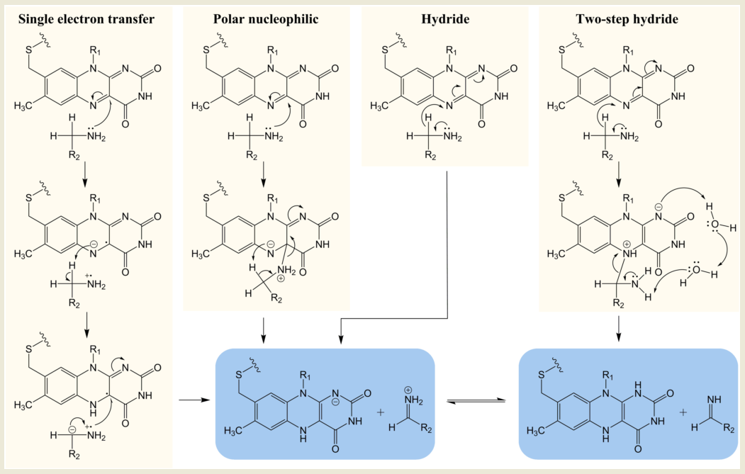 Despite the overall similarity in structure, MAO A and MAO B have different substrate and inhibitor selectivities (for example, [10][41][42][43] defined by the distinct hydrophobicity and binding site architectures but the key region close to the FAD is the same [43]. The chemical mechanism was substantially explored by traditional chemical approaches in the 1990s. Four mechanisms for oxidation of the amine by MAO have attracted investigation: single electron transfer (SET), the polar nucleophilic mechanism or (as found in some other FAD-dependent oxidases) hydride extraction, and a derivative thereof, two-step hydride transfer (see Figure 2). The strong chemical evidence for the single electron transfer mechanism came from in depth studies on the inactivation of MAO by cyclopropylamines and remains a probable mechanism for conversion of a cyclopropylamine into an activated product capable of forming a covalent bond either to the FAD or to a cysteine [22][44]. However, inability to detect a flavin semiquinone radical by electron paramagnetic resonance (EPR) during substrate turnover cast doubt on SET as the general catalytic pathway. Quantum chemical calculations for a SET mechanism for para-substituted benzylamines gave inverse correlation with experimental data, confirming that this is not the mechanism of substrate oxidation [45].