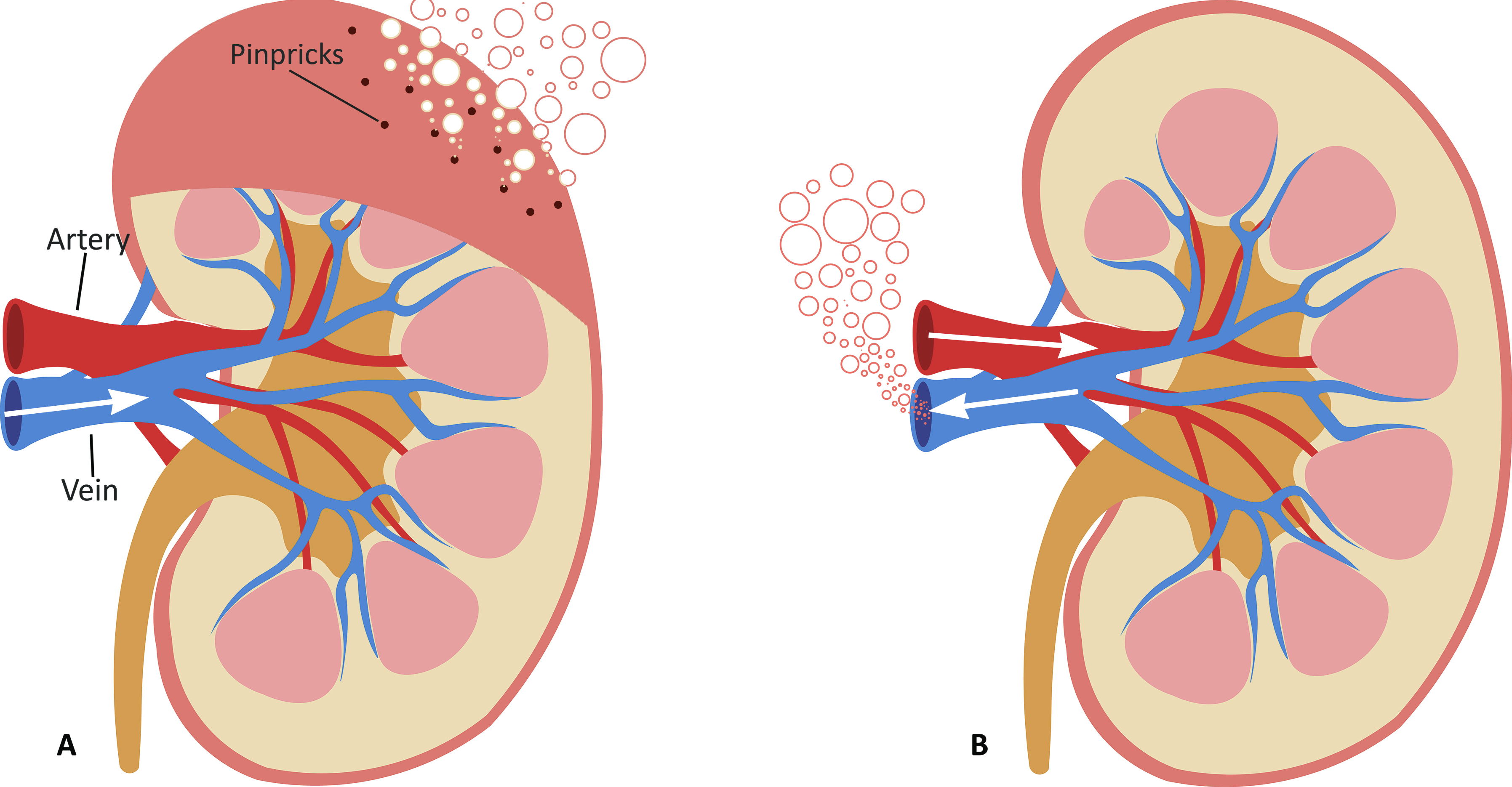 Figure 1. Cross-sectional diagram of the kidney being persufflated using two different approaches: (A) Retrograde Persufflation (R-PSF); with the gas being perfused through the vein and bubbling out through the pinpricks. (B) Anterograde Persufflation (A-PSF); with the gas being perfused through the artery and exiting through the vein.