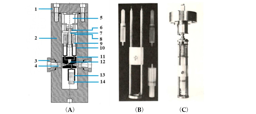 Figure 2. (A) Cross-sectional diagram of the high-pressure vessel and stopped-flow apparatus. (1) Pressure vessel lid, (2) pressure vessel, (3) high-pressure window seal assembly, (4) high-pressure sapphire window, (5) step motor, (6) screwdrive mechanism, (7) drive shaft, (8) syringe thrust plate, (9) reactant syringe pistons, (10) reactant syringes, (11) Kel-F cell block, (12) mixing jet, (13) receiver syringe, and (14) receiver-syringe piston. (B) High-pressure stopped-flow instrument as constructed by van Eldik and co-workers [6]. Essential components, such as syringes and mixing chamber. (C) Complete unit attached to the lid of the high pressure cell.