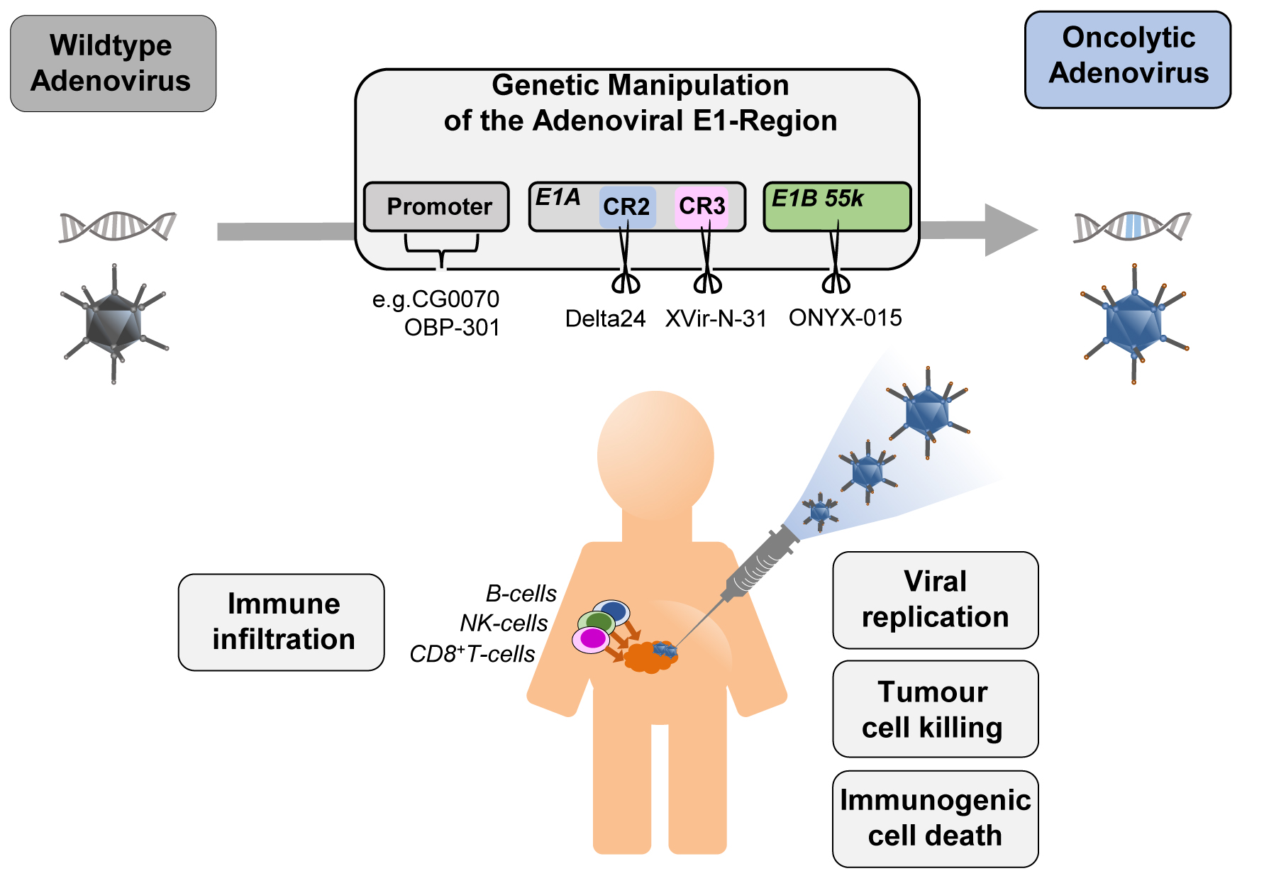 Oncolytic adenovirus therapy is gaining importance as a novel treatment option for the management of various cancers. Different concepts of modification within the adenovirus vector have been identified that define the mode of action against and the interaction with the tumour. Adenoviral vectors allow for genetic manipulations that restrict tumour specificity and also the expression of specific transgenes in order to support the anti-tumour effect. Additionally, replication of the virus and reinfection of neighbouring tumour cells amplify the therapeutic effect. Another important aspect in oncolytic adenovirus therapy is the virus induced cell death which is a process that activates the immune system against the tumour.