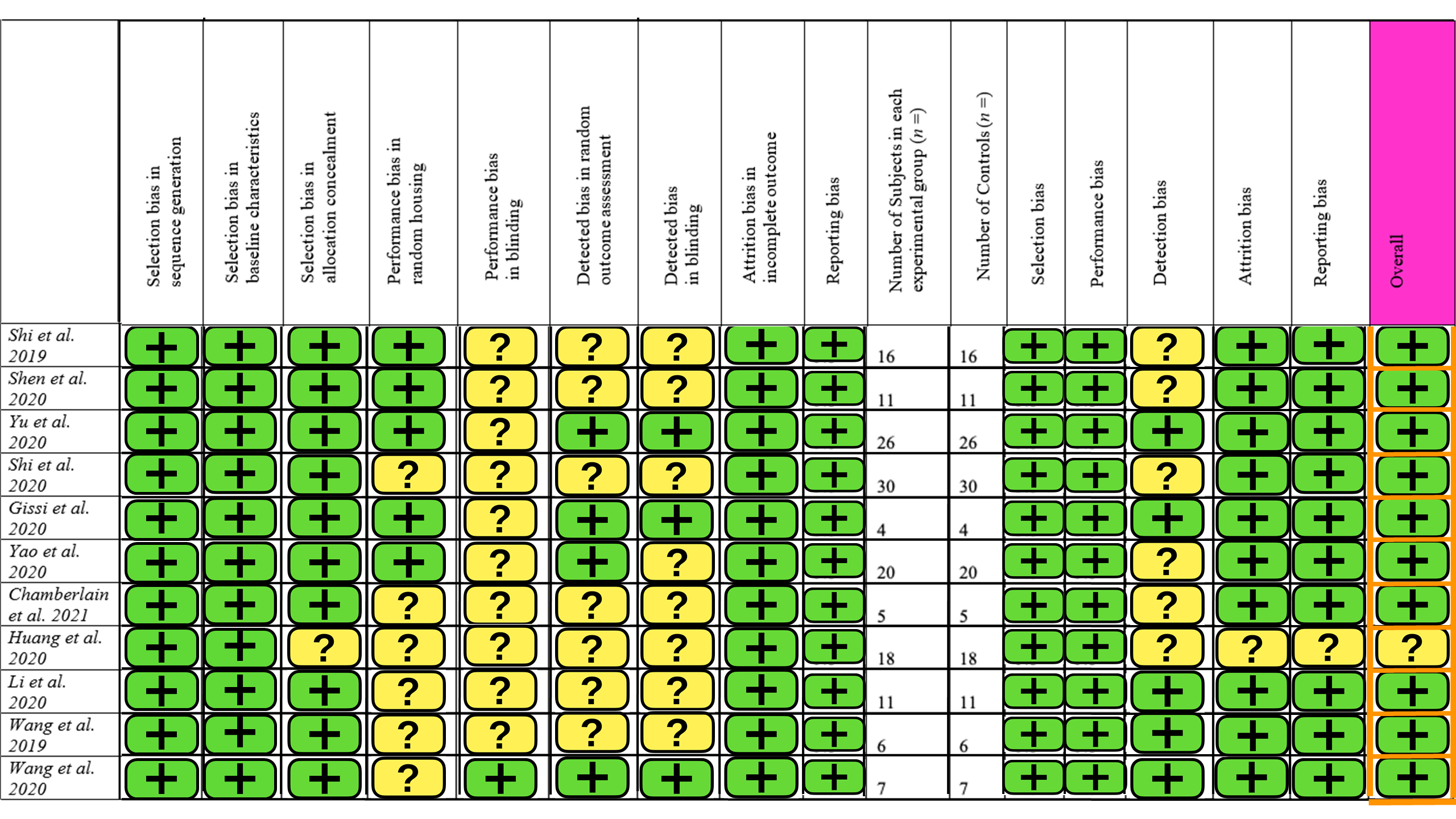 Quality assessment was carried out independently by MT and VL using the SYstematic Review Center for Laboratory animal Experimentation (SYRCLE) tool [23]. The main categories assessed were selection bias, performance bias, blinding bias, attrition bias, and reporting bias. Discrepancies were consulted with WK.
