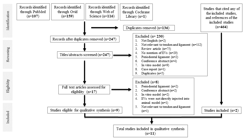 - In vivo model, including method of EV delivery, type of in vivo model, how tendon/ligament injury was induced, animal age, animal weight, animal gender, total number of animals used per experimental group, and follow-up time.