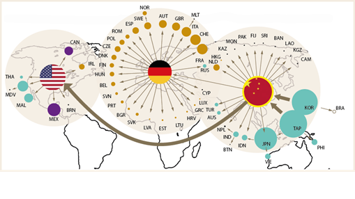 Nowadays, China is central to the entire supply chain network (Figure 2) [6]. Therefore, in almost all nations, manufacturing disruptions in China would create secondary supply shocks in the industry sector [7]. The same would happen in the case of disruptions in Germany, France, Switzerland, or Italy, which are the centers of manufacture in Europe. Similar points apply to North America, regarding Mexico and Canada [8][9].