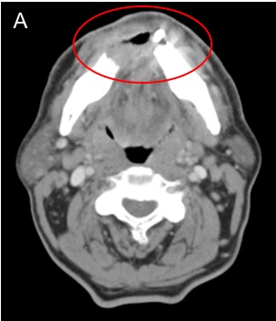 To better evaluate the extent of the primary lesion, its proximity to critical structures such as major vessels, and to assess for lymphadenopathy not appreciable on physical exam, computed tomography (CT) scan of the head and neck with contrast is commonly ordered as part of the initial workup. Compared to other imaging modalities, CT is especially sensitive for detecting osseous involvement, particularly cortical erosions of the mandible and maxilla [40]. Significant bone involvement in oral cancer affects staging and surgical planning. Figure 4 shows CT images of a FOM SCC with tumor enhancement and cortical erosion of the mandible.
