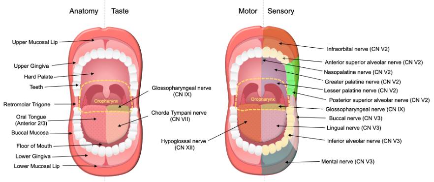 Figure 1. Anatomy and Innervation of the Oral Cavity. The oral cavity cancer site consists of several subsites: oral tongue (anterior two-thirds), floor of mouth, hard palate, retromolar trigone, buccal mucosa, upper and lower mucosal lip, and gingiva. The oral tongue (anterior two-thirds) receives taste innervation from the chorda tympani (CN VII). The posterior 1/3 of the tongue belongs to the oropharynx cancer site and receives taste and sensory innervations by the glossopharyngeal nerve (CN IX). Motor innervation of the tongue is primarily supplied by the hypoglossal nerves (CN XII). Sensory innervation of the oral cavity is supplied by the maxillary (CN V2) and mandibular (CN V3) nerves. Reprinted from Misztal CI, Green C, Mei C, et al. Molecular and Cellular Mechanisms of Perineural Invasion in Oral Squamous Cell Carcinoma: Potential Targets for Therapeutic Intervention. Cancers (Basel). 2021;13(23) [1].