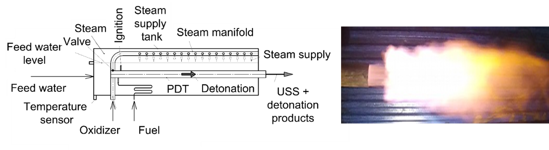 The invention [1] relates to methods and devices for producing USS for use in various technological installations including those for processing and disposal of biomass, SSW, MSW and other wastes using O2-free technologies. Figure 2 shows a schematic of the first version of the USS detonation gun. The main element of the device is a pulse-detonation tube (PDT) referred to as the pulsed USS gun. The inlet of the gun is connected with a steam manifold equipped with a valve. The gun and steam manifold are placed in the steam supply tank with a feed water level sensor and a temperature sensor. The device also includes a spark ignition, oxidizer and fuel supply, and control systems. The gun and the supply lines of the oxidizer and fuel are immersed in the feed water, and the steam manifold with a valve located in the upper part of the supply tank, which is filled with steam.