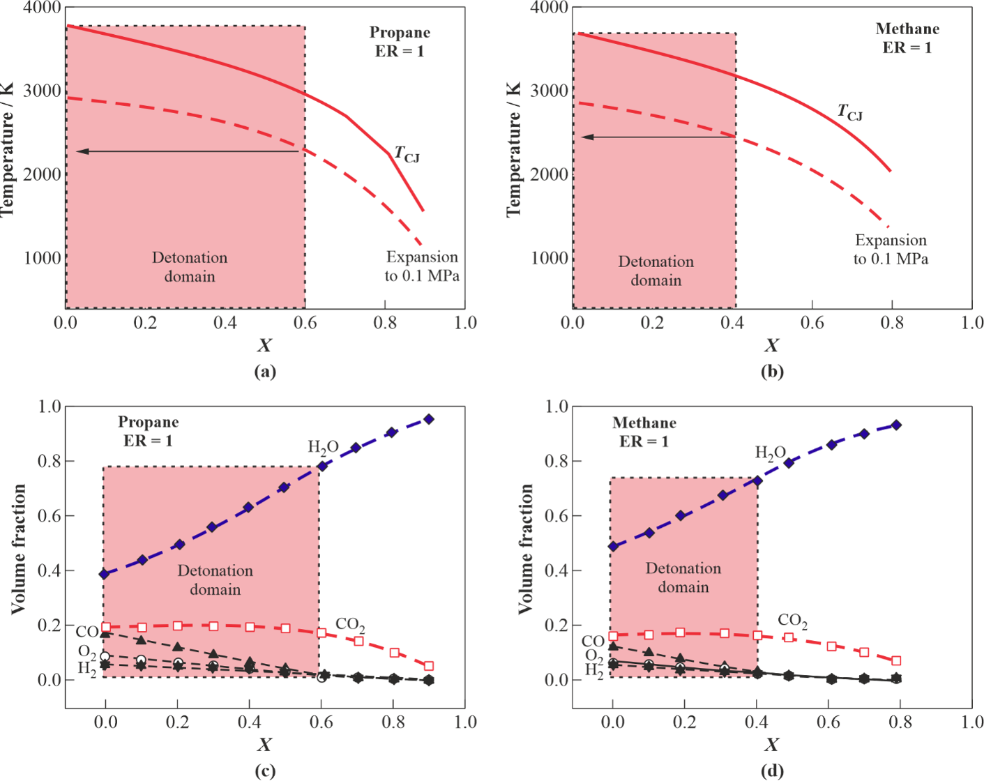 Figure 5. Parameters of detonation products of stoichiometric mixtures C3H8–O2–H2O and CH4–O2–H2O depending on H2O volume fraction (X) after isentropic expansion to atmosphere: (a,b) temperature, (c,d) composition. Conditions in which detonation is registered experimentally are indicated by shaded areas.
