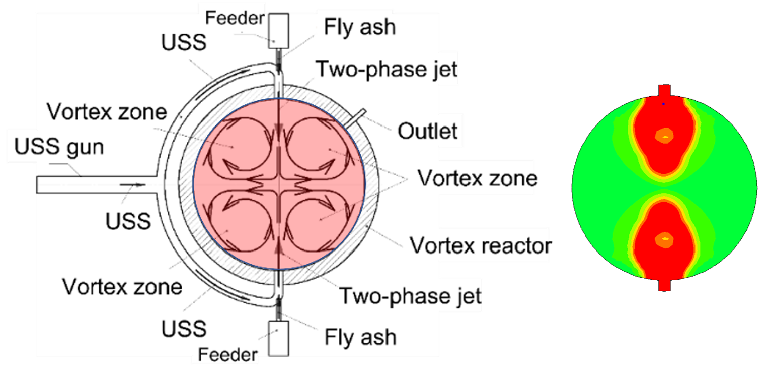 Figure 8. Schematic of fly ash detoxification reactor (left) and injection of USS supersonic jets (right).