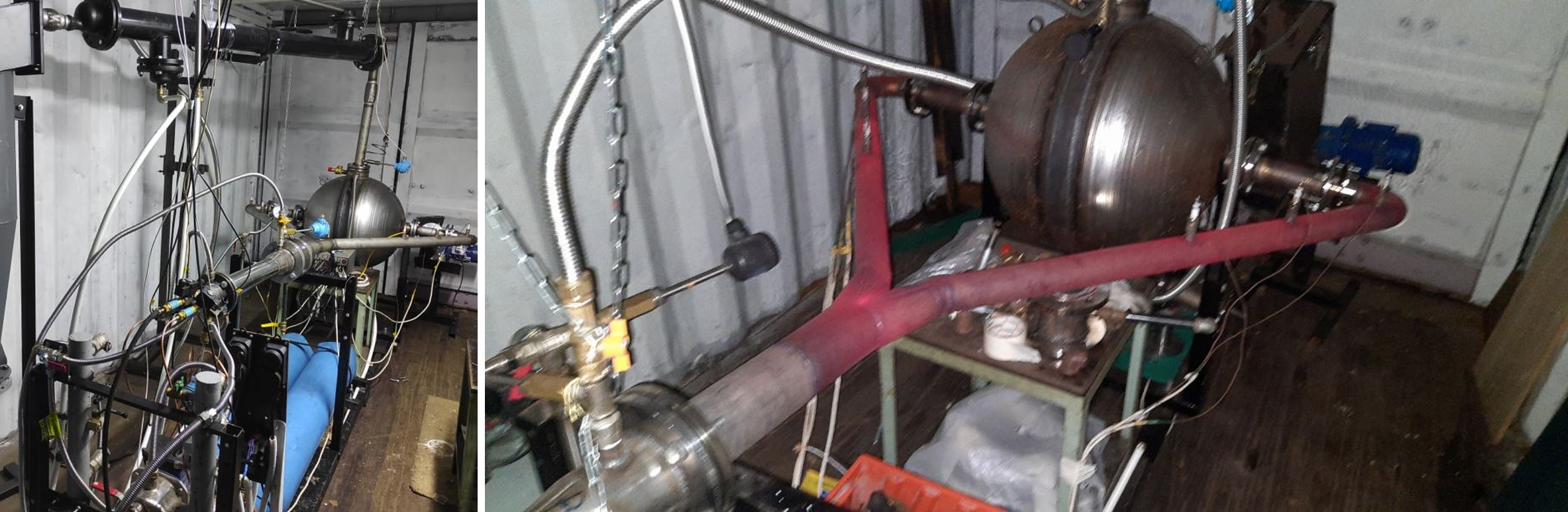 Figure 2. Pulsed detonation steam superheater (left) and its pulsed USS exhaust plume (right).