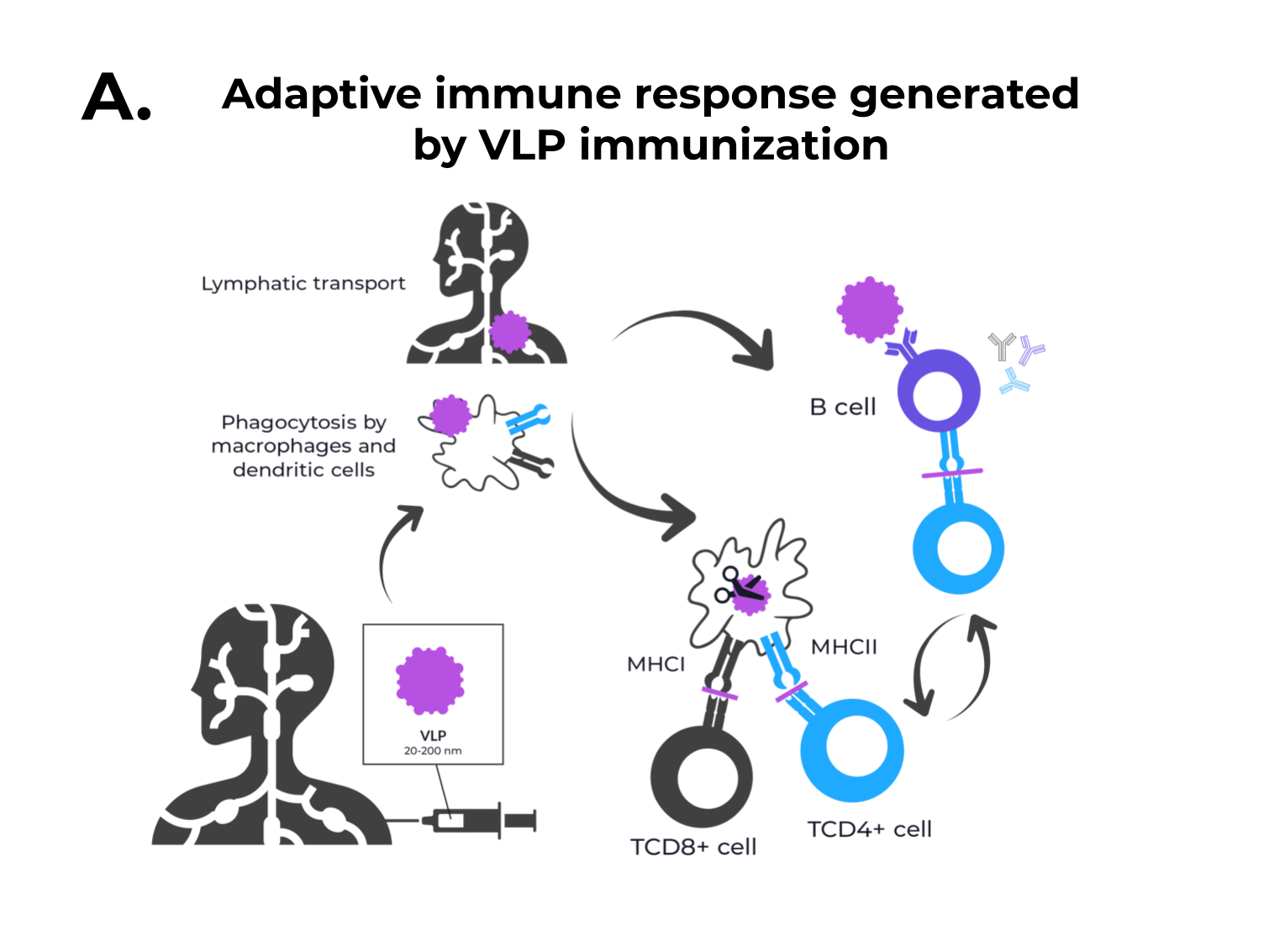 Figure 1. The adaptive immune response generated by VLPs immunization and VLPs classification. (A) After immunization, VLPs are phagocytized by dendritic cells or macrophages. Then, they are carried out to lymphatic vessels, where the antigenic regions will be processed and presented by class II MHC molecules (CD4+ T cells) and, through cross-presentation, by class I (CD8+ T cells). Immunological pathway activation by immunization with VLPs will activate robust cellular (cytokines) and humoral (B cell-antibodies) immune responses. (B) VLPs are classified as nonenveloped (neVLPs) or enveloped VLPs (eVLPs) based on the absence or presence of a lipidic membrane, respectively. These particles can also be classified as homologous or heterologous VLPs according to their composition. Homologous VLPs are assembled using proteins from the native pathogen only (blue), and heterologous VLPs can be assembled using proteins or peptides from different sources (black and blue).