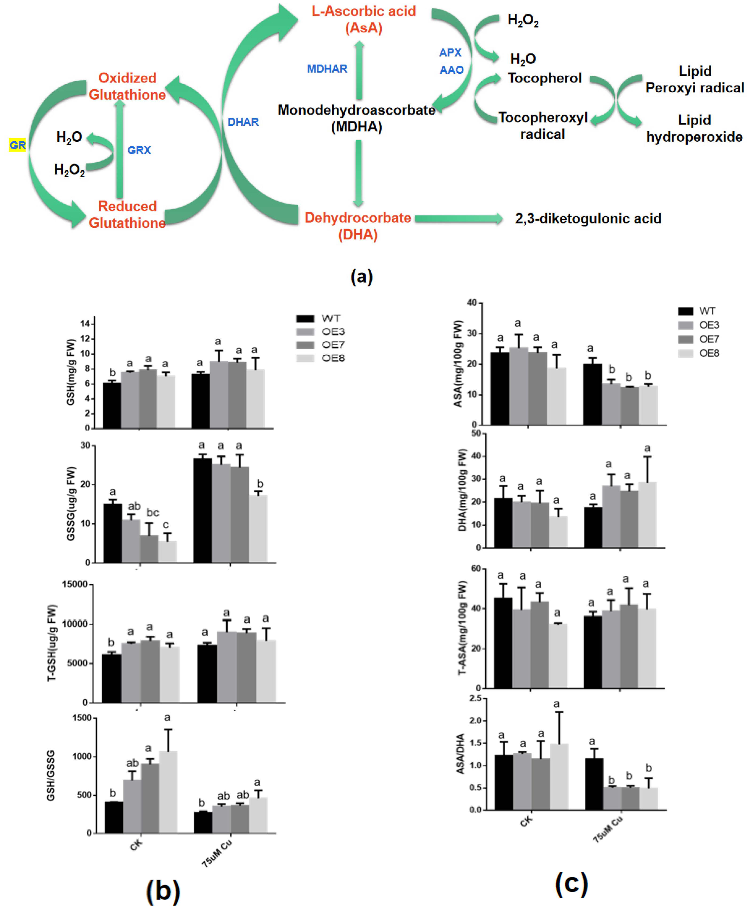In the cycle of ASA-GSH (Figure 6a) [48], ASA and GSH are both important reducing substances in plants. Their oxidation/reduction status is closely related to the stress tolerance ability of plants. Therefore, researchers analyzed the changes in the status and content of these two antioxidant substances under copper stress.