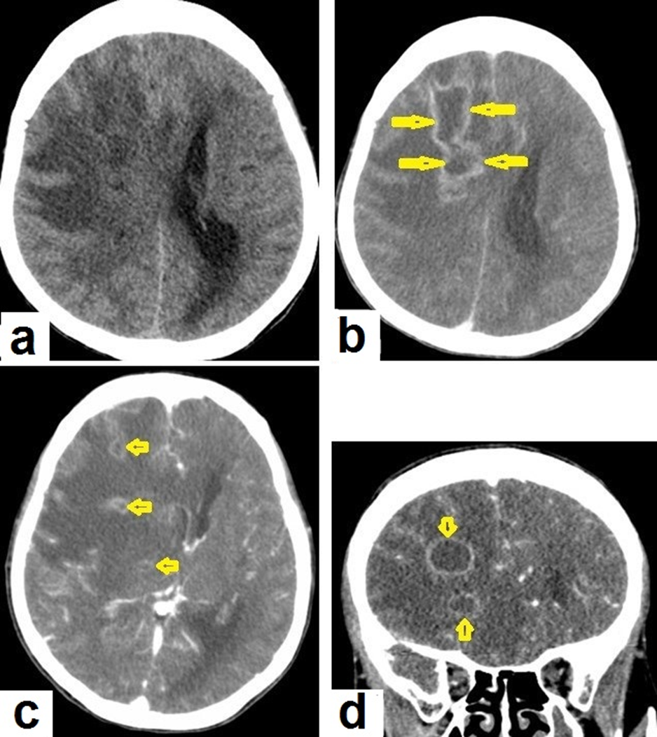 Figure 15. Tuberculous abscesses and tuberculomas in a 70-year-old woman with disturbance of consciousness and long history of headache. Selected axial computed tomography (CT) images of the brain (a) axial non-enhanced CT show significant vasogenic edema in the frontal and parietal lobes of the right cerebral hemisphere, with severe mass effect manifested as loss of the cortical sulci, total effacement of the right lateral ventricle and mild midline shift to the left side. (b) Contrast-enhanced CT (CECT) shows loculated rim-enhancing lesion centered in the right frontal lobe measures about 39 × 16 × 12 mm, suggesting cerebral abscess (arrows). (c) Axial CECT shows multiple ring-enhancing lesions in the right cerebral hemispheres and right basal ganglia (short arrows) suggesting of cerebral abscesses or tuberculomas. (d) Coronal CECT shows multiple ring-enhancing lesions in the right cerebral hemispheres (short arrows), suggesting cerebral tuberculomas or abscesses.