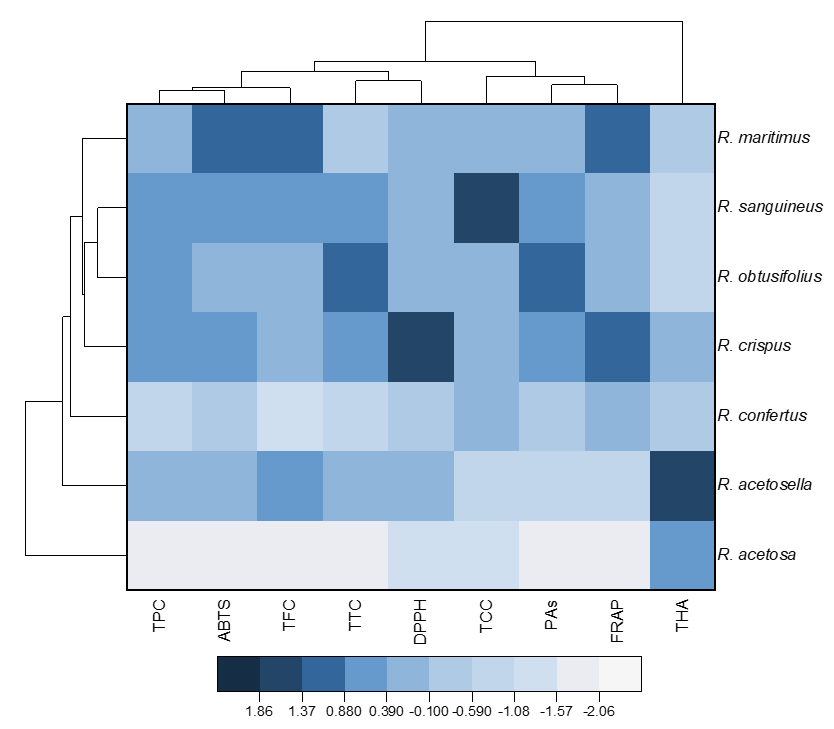 Figure 1. Heat map with clusters for studied variables (at the top) and Rumex species (at the left). TPC, total phenolics content; TFC, total flavonoids content; THA, total hydroxycinnamic acids; TCC, total catechins content; PAs, total proanthocyanidins content; TTC, total tannins content; DPPH, antioxidant activity determined by the DPPH (2,2-diphenyl-1-picrylhydrazyl) assay; ABTS, antioxidant activity determined by the ABTS (2,2′-azino-bis(3-ethylbenzothiazoline-6-sulfonic acid)) assay; FRAP, ferric reducing antioxidant power.
