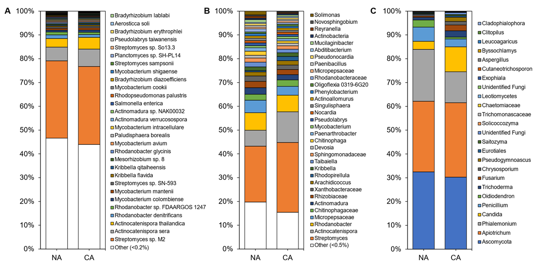 The root and leaf-associated microbiomes were further independently characterized with SIMPER to identify taxa that contributed the most dissimilarity between NA and CA regimes (Table 1). For microbiota isolated from the rhizosphere, the taxa contributing to the top ~25% of dissimilarity were Streptomyces sp. M2, A. sera, and A. thailandica for the shotgun data, the genera Actinocatenispora and Streptomyces for the 16S data, and the genera Phialemonium and Apiotrichum for the ITS data. For leaf samples, taxa contributing to the top ~25% dissimilarity were M. aeruginosa and Streptomyces sp. M2 for the shotgun data, the genera Pseudomonas and Rhodococcus for the 16S data, and the genera Aspergillus and Goidanichiella for the ITS data.