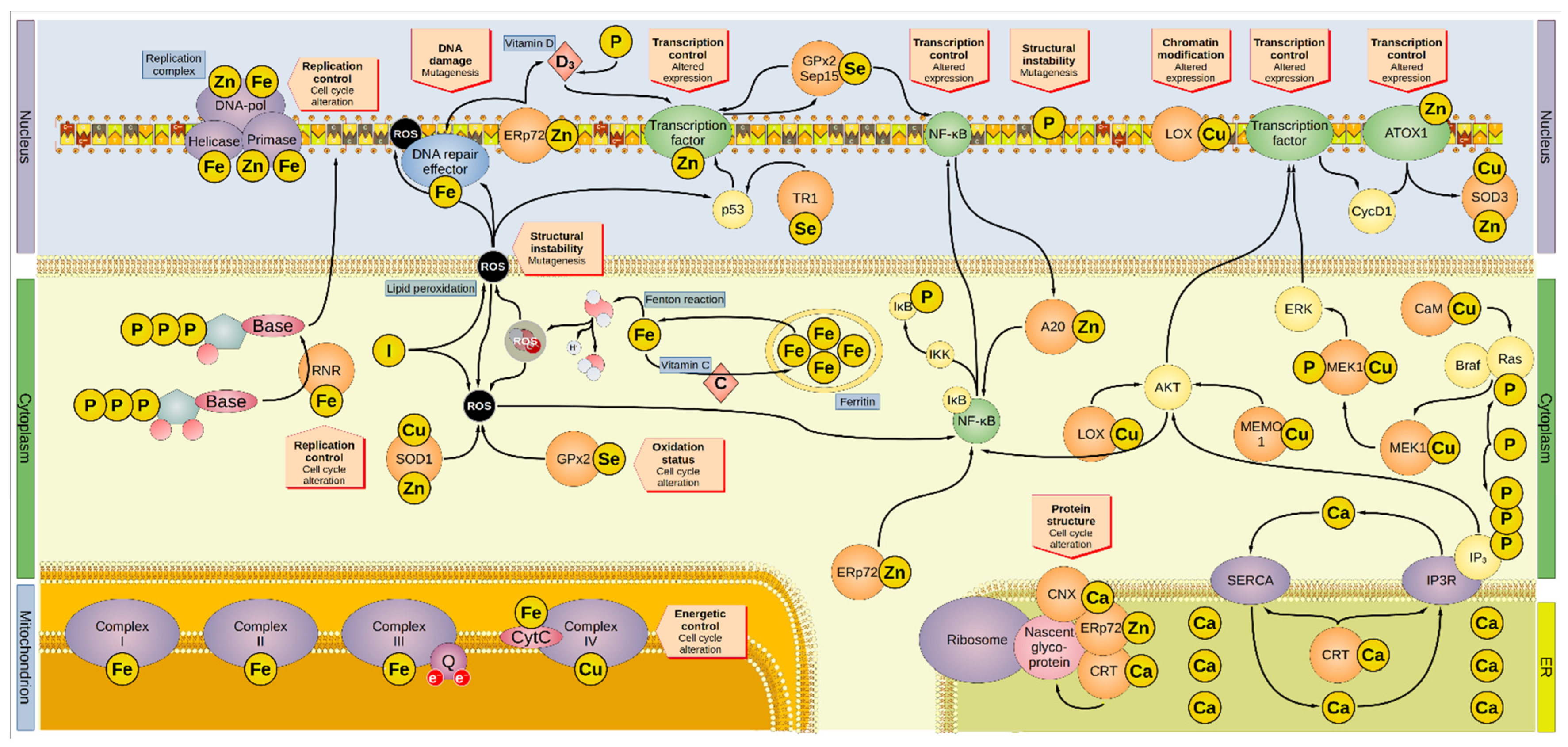 Figure 1. Overview of the involvement of minerals in oncogenesis. Minerals are involved in several and overlapping cellular pathways. Iron is sequestered by ferritin inside the cytoplasm. Iron leaking from the ferritin cages can react with water to form hydroxyl radical, one of the many ROS. Vitamin C promotes the reload of iron inside the ferritin cages. ROS can interact with lipid bilayers, generating more ROS molecules by lipid peroxidation, a process inhibited by iodide. In addition, ROS can directly damage the DNA and proteins, including the DNA-repair enzymes that are activated by ROS-induced damage. Furthermore, ROS activates p53 and NF-κB, altering the cell cycle. Iodide, SOD1, and GPx2 inactivate ROS. For instance, SOD1 removes superoxide radicals by dismutation reaction generating H2O2, O2, and GPx2 by producing two H2O from auto-reduction. The DNA-repair factors are modulated by the zinc-protein ERp72, which regulates the intake of vitamin D involved in the regulation of transcriptional factors. Cellular intake of vitamin D is also regulated by phosphorus. ERp72 reduces disulfide bonds in nascent proteins in the ER, in association with the calcium-proteins CNX and CRT. Moreover, ERp72 regulates NF-κB, the latter being also modulated by GPx2 and Sep15. GPx2 and Sep15 promote their own expression. A20 and AKT also activate NF-κB, which then reduces the activity of A20 in a negative feedback loop. AKT is modulated by LOX, MEMO1, and IP3, and affects the cell cycle by promoting the expression of CycD1. LOX can alter genetic expression by modifying the histones. Some transcription factors contain zinc, and a transcription regulator is p53, which TR1 modulates. ATOX1 is a zinc-containing protein that can modulate gene expression, particularly that of cyclin D1 and SOD3 (which regulate the oxidative environment outside the cell). Genetic transcription and cell cycle are regulated by ERK, which MEK1 activates after being phosphorylated by the complex Ras/Braf. One of the modulators of Ras is CaM, but also phosphorus can directly boost its activation. Similarly, phosphorus is also part of active IP3 that, aside from its direct modulation of AKT, regulates the release of calcium (effectively a second messenger on its own right) from the ER via the Ca2+ channel IP3R. The P-type ATPase SERCA mediates the transport of cytosolic calcium back into the ER. CRT regulates both IP3R and SERCA. Moreover, minerals are involved in DNA replication since they are embedded in several subunits of the DNA replication complex (namely: iron in the helicase, primase, and DNA-polymerase α, the latter two also containing zinc). Iron is present in the first three mitochondrial complexes and CytC, whereas copper is present in complex IV. Thus, minerals are essential to the energetic balance of the cell and its oxidative state. AKT, Ak strain transforming; A20, zinc finger protein A20; ATOX1, antioxidant-1; Braf, rapidly accelerated fibrosarcoma isoform B; CaM, calmodulin; CNX, calnexin; CRT, calreticulin; CycD1, cyclin D1; CytC, cytochrome c; DNA-pol, DNA polymerase; ER, endoplasmic reticulum; Erp72, endoplasmic reticulum resident protein 72; ERK, extracellular signal-regulated kinase; GPx2, glutathione peroxidase 2; IκB, NF-κB inhibitor; IKK, IκB kinase; IP3, inositol 1,4,5-trisphosphate; IP3R, inositol trisphosphate receptor; LOX, lysyl oxidase; MAPK, mitogen-activated protein kinase; MEK1, MAPK/ERK kinase1; MEMO1, mediator of cell motility 1; NF-κB, nuclear factor kappa-light-chain-enhancer of activated B cells; Q, coenzyme Q; Ras, rat sarcoma virus; RNR, ribonucleotide reductase; ROS, reactive oxygen species; Sep15, selenoprotein of 15-kDa; SERCA, sarco-/endoplasmic reticulum calcium ATPase; SOD, superoxide dismutase; TR1, thioredoxin reductase 1.