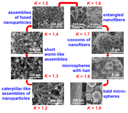 Phase separation of oligomers as an oily liquid (Figure 12, right branch) occurs with large flexible monomers with low functional-group density. The “oil” continues to react internally until it is solidified (arrested). Depending on the speed of solidification and the properties of the medium, the structural diversity that can be generated via this process can be extremely broad. For example, the oily phase may start out as thin, hair-like filaments that evolve into small droplets embedded within fibers; among other possibilities, the latter morphology may evolve into large particles with or without fibers emanating from their surface. By choosing the right monomers and adjusting the reaction rate (for example, via adjustment of monomer concentration, or by using an appropriate catalyst), any skeletal framework with these morphologies can be “frozen” (kinetically trapped) in place before it has time to evolve into the next step. Polyurea aerogels are an extremely versatile class of materials that enable observation and, in some cases, design of those morphologies in the final products. For example, Figure 13 shows a very large array of nanostructures, all with identical chemical composition, prepared via reaction of Desmodur N3300A (see Figure 9) and water (see Figure 4b) in various solvents at different monomer concentrations.