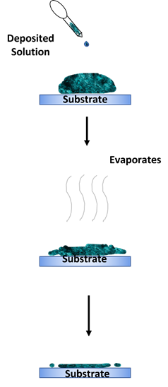 The drop casting method is an alternative deposition method that is more suitable for small-area deposition [73][74][75]. This method is performed by dropping a specified amount of solution on a static substrate and letting the solution evaporate for a desired amount of time. The substrate can also be baked to enhance the evaporation process. A solid thin film will then be formed on the substrate once the solution has dried up. The advantage of this method is its simple process. However, this method’s main disadvantages are the difficulty in obtaining a uniform and continuous coating on the deposited layer. The thickness of the deposited layer is also uncontrollable. Figure 8 shows an illustration of the drop casting method.