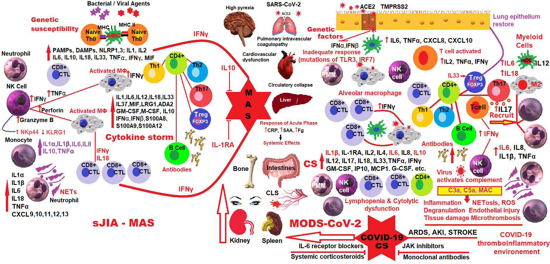 COVID era has shown that there are serious cases in which the patient's antiviral overregulated response becomes harmful by itself, as in sJIA-MAS. This entry draws attention to the fact that the failures in the treatment of MAS in sJIA patients, and those with severe COVID-19 could be due to a misunderstanding of the two different and opposed MAS immunopathologies - one with loss of immune function, and the other with gain of immune function. It is considered that MAS reaches its highest point through a multiple interactive network of infectious, genetic, innate immune deregulated factors, that could generate distinct conditions, such as sepsis, sJIA, AOSD, cancer etc.