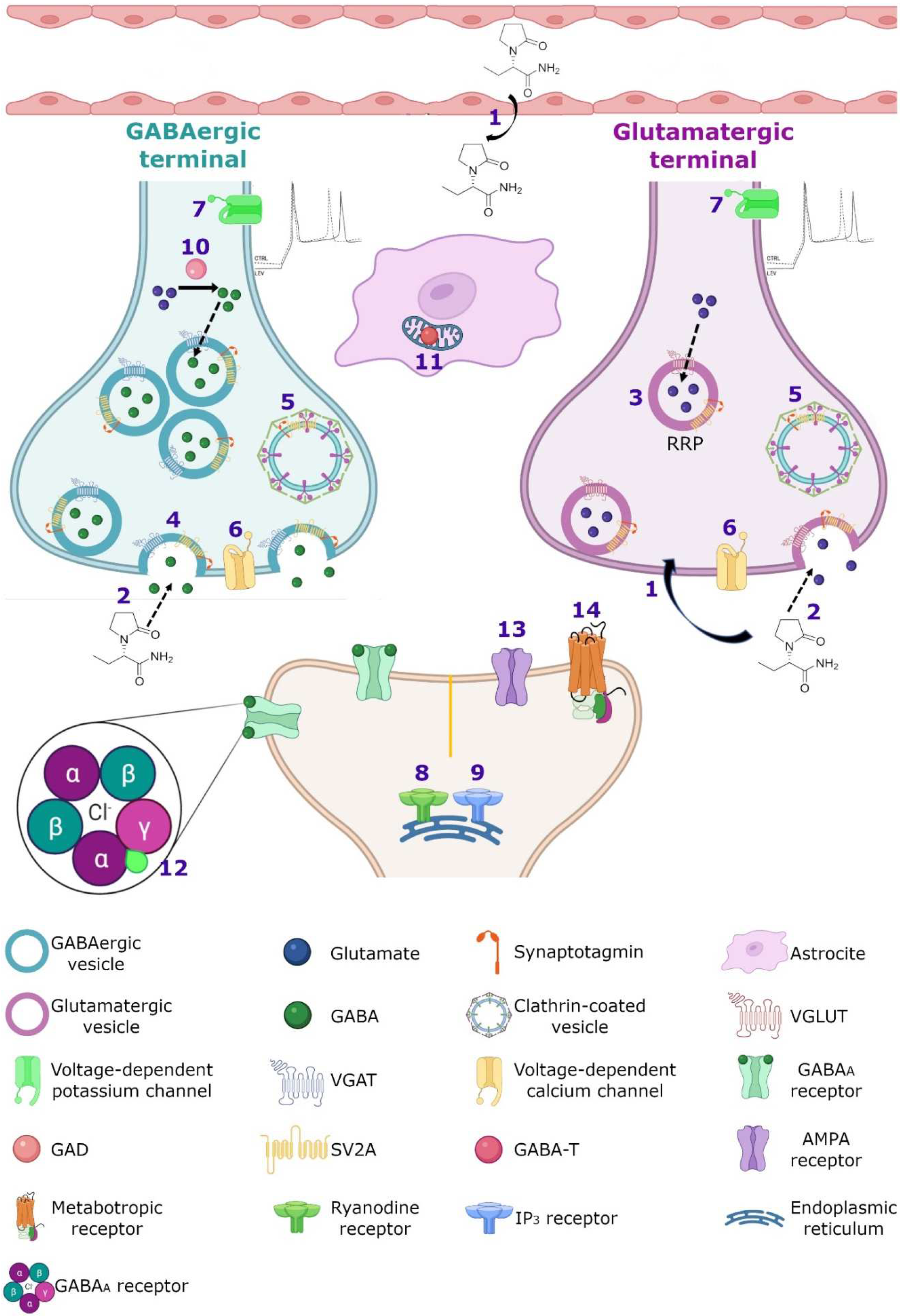 Figure 3. Hypothetical integrated molecular mechanisms of action of LEV. (1) LEV diffuses throughout the blood–brain barrier and neuron membrane or enters during (2) exocytosis and endocytosis processes, subsequently exerts its action by various mechanisms. (3) LEV could decrease the function of SV2A during vesicular priming and thus diminishes the readily releasable pool and therefore the release of neurotransmitters (purple terminal). Another possibility is that LEV stabilizes SV2A and improves its function during (4) exocytosis, and (5) endocytosis modulating the expression and traffic of synaptotagmin protein. (6) Moreover, it has been reported that LEV blocks the voltage-dependent calcium channels, decreasing the synaptic transmission. (7) LEV reduces potassium currents inducing a decrease in the repetitive action potential generation. With respect to calcium intracellular systems, LEV reduces the calcium transients of (8) ryanodine and (9) IP3 receptors. In the GABAergic system, LEV modulates the region-dependent (10) glutamic acid decarboxylase (GAD) and increases (11) GABA transaminase (GABA-T). In the post-synapse, LEV blocks the effect of the (12) GABAA receptor antagonists. In the glutamatergic synapse, LEV modulates (13) AMPA receptors and decreases the excitatory current. (14) Finally, LEV interacts with noradrenaline, adenosine and serotonin receptors in post-synapse involved in pain system.