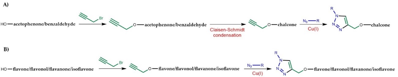 Figure 2. General steps for the synthesis of flavonoid hybrids conjugated with 1,2,3-triazole. A) Synthesis of chalcone-1,2,3-triazole hybrids. B) Synthesis of flavone/flavonol/flavanone/isoflavone-1,2,3-triazole hybrids.