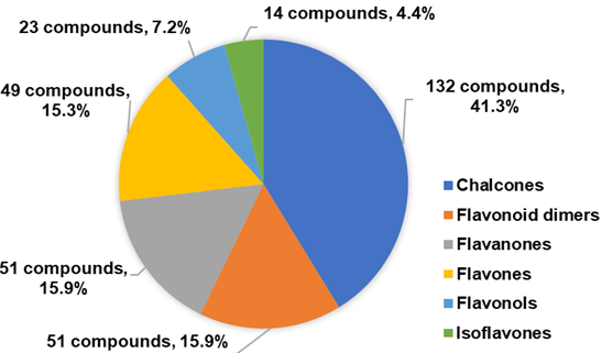In this chapter, more than 300 synthetic 1,2,3-triazole linked flavonoid hybrids with antitumor activity, including chalcones, flavanones, flavones, flavonols and isoflavones, have been reported since 2017. The conjugation of flavonoids by CuAAC giving rise to bioactive flavonoid dimers was also described. As shown in the Figure 3, chalcones was the most common flavonoid subclass.
