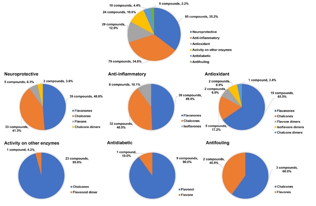 Besides antitumor and antimicrobial activities, a total of 163 flavonoid hybrids conjugated by the 1,2,3-triazole ring with other activities, including neuroprotective, anti-inflammatory, antioxidant, antidiabetic, and antifouling, were also reported since 2017 and recorded. Moreover, some of these compounds have been shown to be modulators of other enzymes, namely carbonic anhydrase, serine proteases and glutatione S-transferase. The distribution of the different classes of flavonoids is highlighted in Figure 5.