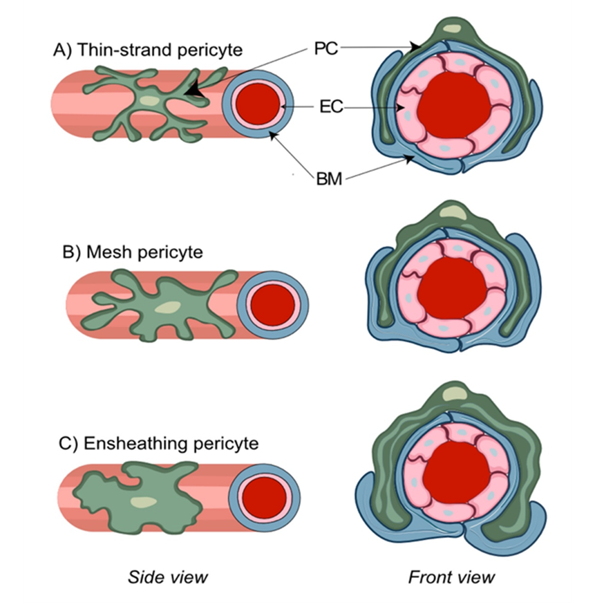 Figure 2. Morphological features of distinct pericyte (PC) subtypes. PC are characterized by a typical “bump on a log” appearance arising from an ovoid protruding nucleus and extending cytoplasmic processes that contact the abluminal side of the vascular basal membrane (BM) and run inside of its duplicature. Thin-strand pericytes (A) possess relatively long thin cytoplasmic processes with a complex branching pattern that sparsely cover brain capillaries. Mesh pericytes (B) have a less complex branching pattern and their thicker and shorter processes provide more comprehensive coverage of brain capillaries. Ensheathing pericytes (C) are characterized by the least complex branching pattern and almost complete coverage of pre-capillary arterioles.