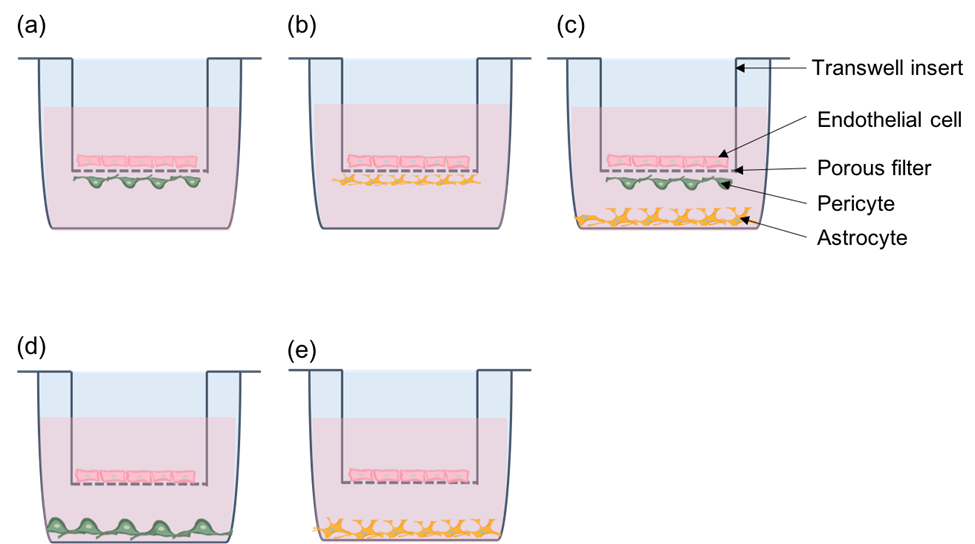 Figure 6. Transwell system for co-culture. (a) Direct contact model with endothelial cells and pericytes. (b) Direct contact model with endothelial cells and astrocytes. (c) Tri-cellular culture model with endothelial cells, pericytes, and astrocytes. Endothelial cells and pericytes are in contact. (d) Non-contact model with endothelial cells and pericytes. (e) Non-contact model with endothelial cells and astrocytes.