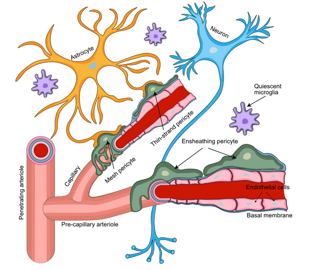 Figure 1. Perivascular arrangement of pericytes among NVU cellular structures. Pericytes extend their ramified processes along the brain vasculature, coming into direct contact with the vascular endothelium and astrocytic end-feet. Pericytes embedded in the capillary basement membrane, together with the endothelial cells of the capillary wall and astrocytic end-feet, form the blood-brain barrier. Different types of pericytes are found in distinct locations of the NVU. Ensheathing pericytes occupy mostly pre-capillary arterioles, while mesh and thin-strand pericytes are found mainly at the capillary portion of the brain microvasculature.