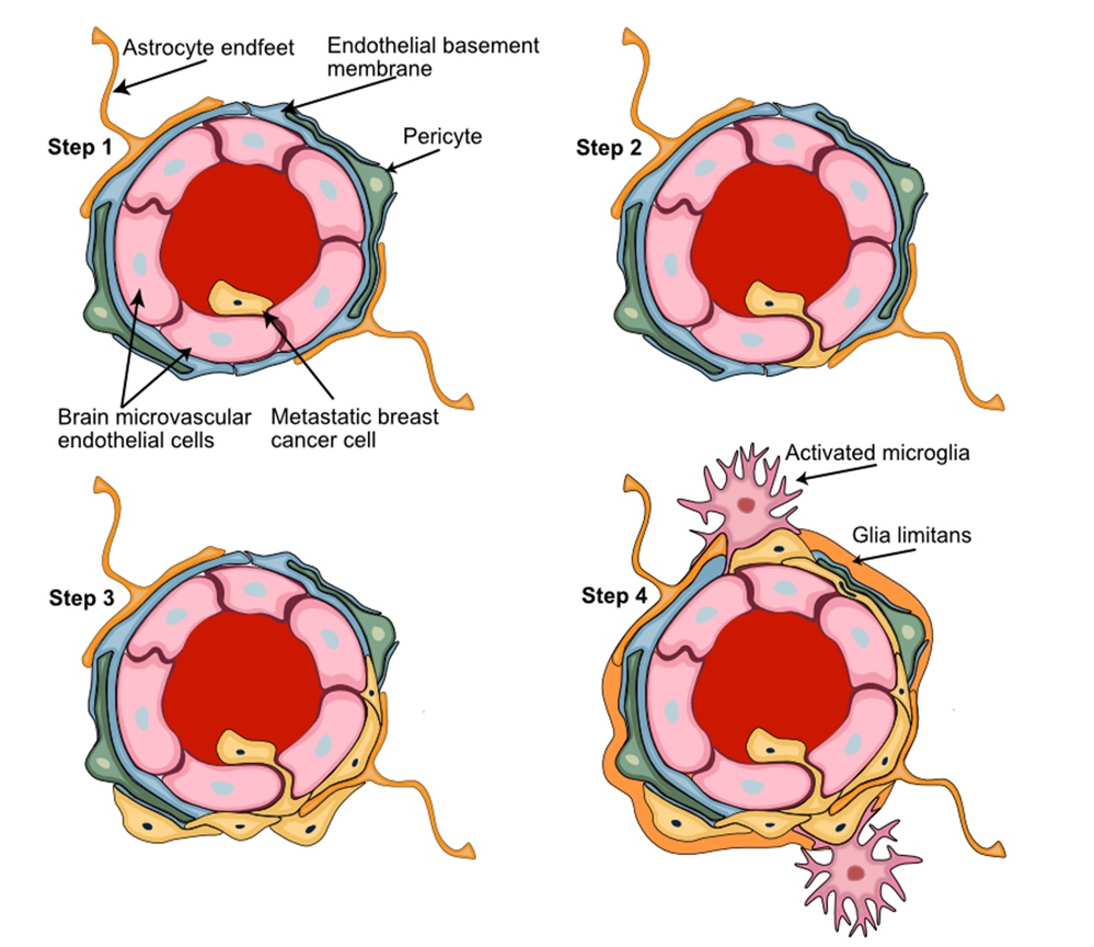 Figure 4. Key steps of the breast-to-brain metastatic process. Step 1) Adhesion of the metastatic circulating breast cancer cells to the brain microvascular endothelial cells; Step 2) BBB passage of metastatic cells leaving the circulation by transendothelial migration; Step 3) Adaptation and proliferation of the metastatic cells in their new perivascular niche; Step 4) Establishment of the tumor microenvironment with metastatic breast cancer cells interacting with the key NVU cellular partners pericytes, astrocytes, and microglia. Astrocyte foot processes associated with the parenchymal basal lamina form the outermost layer of central nervous tissue known as Glia limitans.