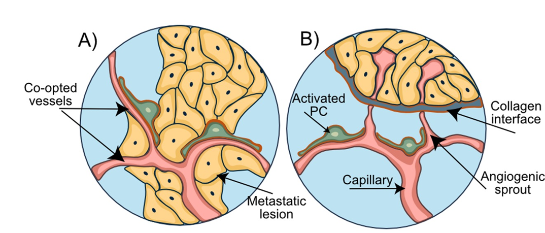 Figure 5. Invasion patterns of breast-to-brain metastasis. A) Breast-to-brain metastases are of the papillary type and characterized by the abundant vessel co-option and close direct contacts between the breast cancer cells, blood vessels, and pericytes. B) Brain metastases of the pushing type, originating for example from colon cancer, show a distinct collagen layer separating the metastatic lesion from the capillaries and surrounding pericytes.