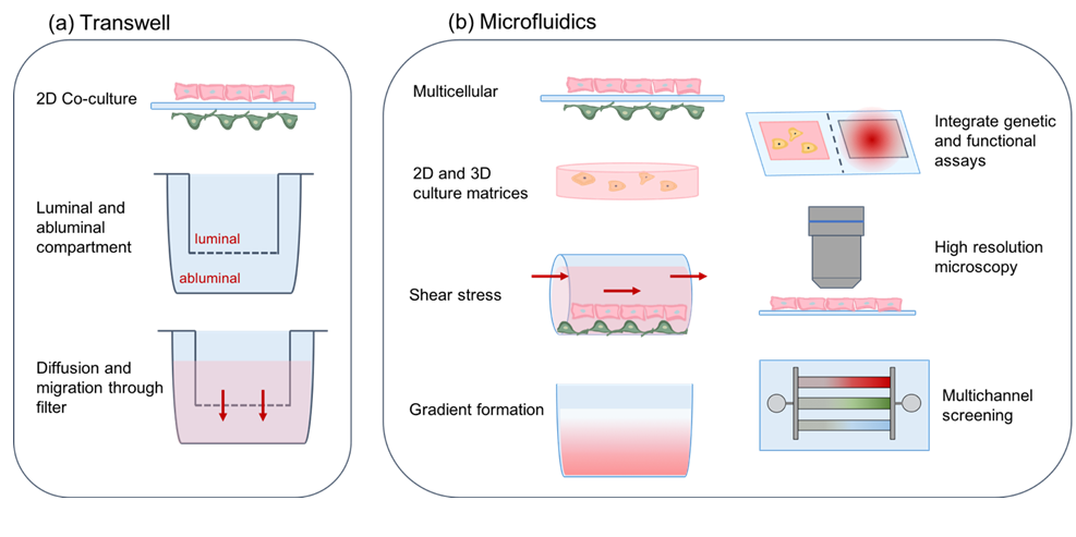 Figure 7. Properties of BBB in-vitro models. (a) Transwell systems utilize a porous filter insert that divides culture wells into luminal and abluminal compartments and allows for diffusion of molecules and cell migration across the filter. (b) Microfluidic devices recapitulate a more complex tissue environment in-vitro by co-culturing cells in 2D and 3D matrices. Parameters including shear stress and gradient formation are tunable to establish a controlled microenvironment. Microfluidics enable integration of sensing systems and high resolution microscopy. Multichannel designs allow samples to be screened in parallel, creating compact medium-throughput systems for simulating biological conditions and enabling drug screening. Brain EC are shown in pink on the luminal side and brain pericytes are marked in green on the abluminal side.