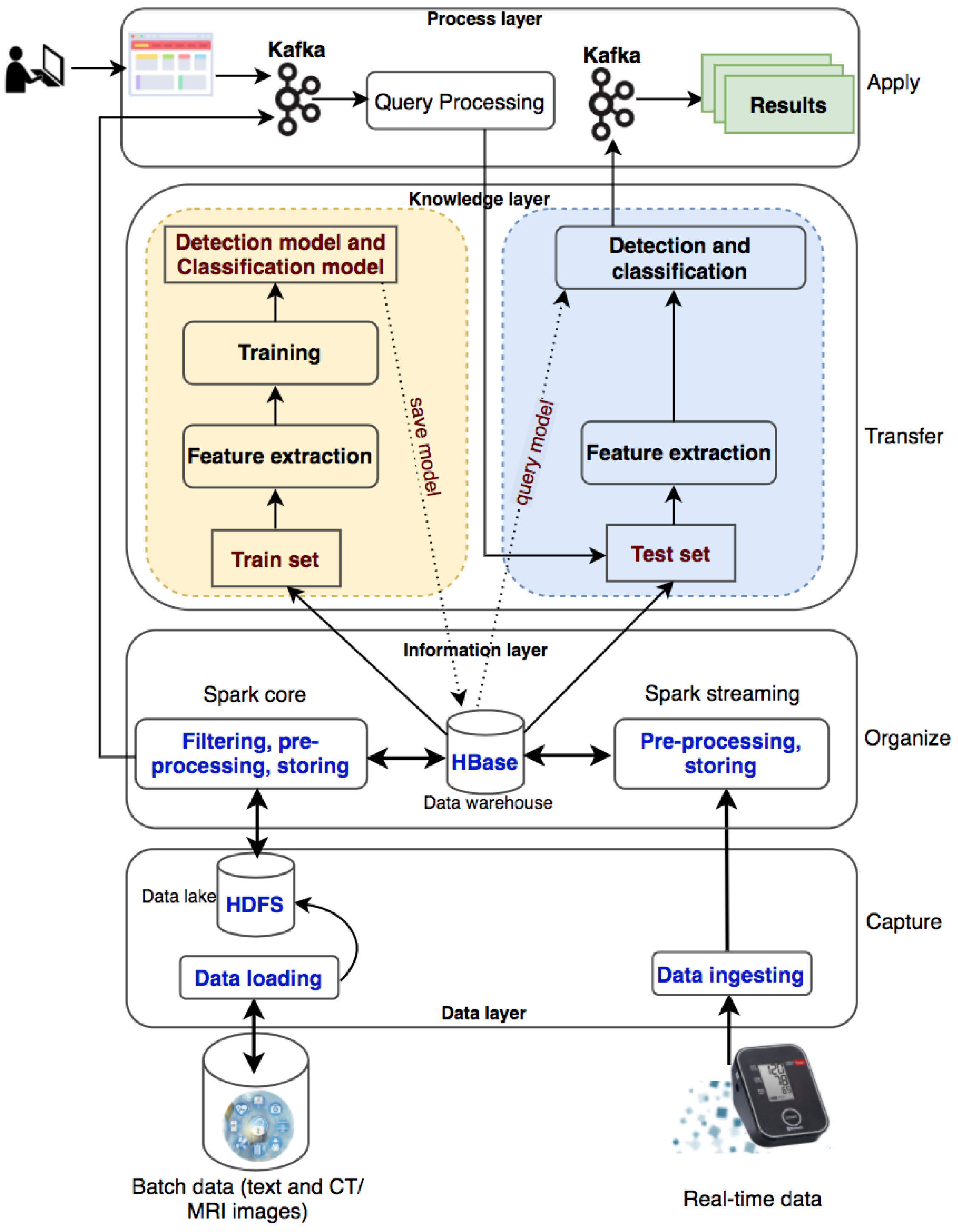 The system processes two types of data: batch data (patient records collected over a long time period) and real-time data (collected from wearable devices). The batch data are loaded into the data lake (HDFS) and the real-time data are ingested into the processing system with Kafka and Spark streaming. With a large amount of medical data, the system will filter out useful information for disease diagnosis and classification, preprocess information, and store information into HBase. The information will be used for knowledge transformation to create machine-learning models. New knowledge is created and made available to users through queries from websites or wearable devices.