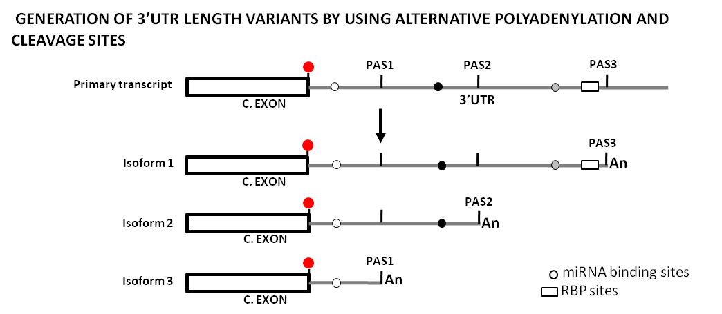 Figure 3. Original drawing showing the use of alternative polyadenylation and cleavage sites to generate sequence length variability at 3’UTRs and its potential impact on the regulatory landscape by miRNAs and RBPs. This diagram represents the generation of three different transcript isoforms from a primary transcript by the use of three different polyadenylation and cleavage sites (PAS1, PAS2, PAS3), and how this changes the mRNA regulatory landscape. Shown is a terminal coding exon with its stop codon (red dot), as well as the 3'UTRs (gray lines) with the different PAS, miRNA binding sites (gray dots), and a RBP site (white box). [An] stands for the poly-A tail. C.EXON stands for Coding Exon.