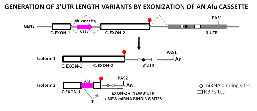 Mammalian 3’UTRs harbor a number of mobile genetic elements from the Short/Long Interspersed Nuclear Element (SINE/LINE) families, and among them the family of Alu repeated sequences [100]. Alu elements can be found in clusters in intergenic or intronic regions, or embedded in transcriptional units, mostly in the 3’UTRs of mRNAs but also in their 5’UTR or coding regions [101]. Although most of the Alu elements are currently stable genomic fossils, a very small number of Alu elements (called “young” or “master”Alus) are still retrotransposition-competent [102]. Alu repeats can impact on mRNA function by different mechanisms, and among them by “exonization”, by which the splicing machinery incorporates, “de novo”, an intronic Alu element to a mature transcript with the subsequent structural modifications derived of the functional activation of alternative stop-codons and polyadenylation signals encoded in or downstream of the Alu element ([103] and Figure 5).