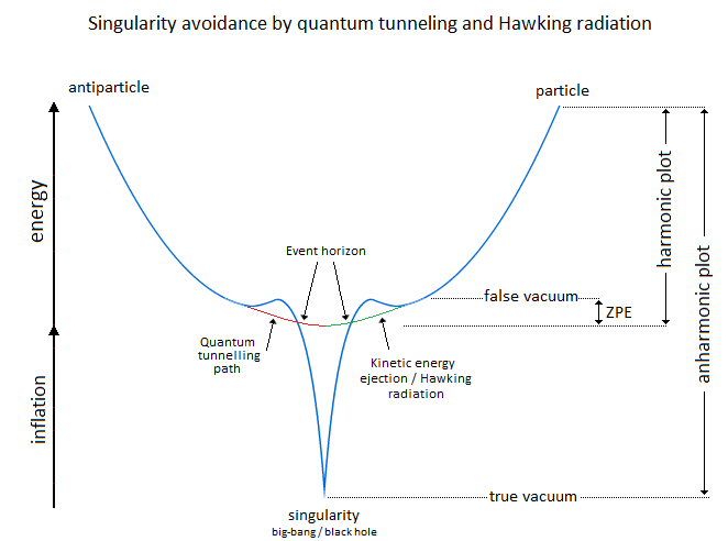 In the following illustration Figure 4 an integration of the gravitational singularity still disturbs the harmonic shape of the potential well. The greater the kinetics of the particle in its oscillation, the more the shape of the potential well tends towards harmony by avoidance of the gravitational singularity. But if the kinetics of the particle are stopped, then the particle falls to the bottom of this gravitational singularity and traces the anharmonicity of the potential well. In the opposite case if the particle should to come out of its state of true vacuum to reach the higher energy levels, should correspond to the inflation for the universe and later that of the atom through another anharmonicity.