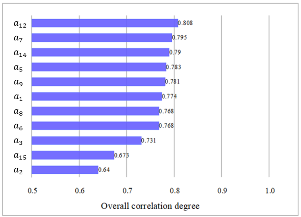 According to Figure 3, the correlation degree between the 11 factors and the carbon trading price was greater than 0.5, which shows that the above 11 factors had a significant impact on the carbon trading price. The correlation degrees of the industrial development level (𝑎12), low-carbon industry development level (𝑎6), air pollution (𝑎14) and green technology maturity (𝑎5), which were in the top four positions, were 0.808, 0.795, 0.790 and 0.783, respectively. These factors had the most significant correlation with the carbon trading price, and the influence degree decreased in turn. The top four correlations included one economic factor, one environmental factor and two green industry factors. The free carbon quotas issued by the government (𝑎1), with the largest relevance among the policy factors, ranked sixth. It can be seen that among the four factors, the policy factors had the lowest impact on the carbon trading price.
