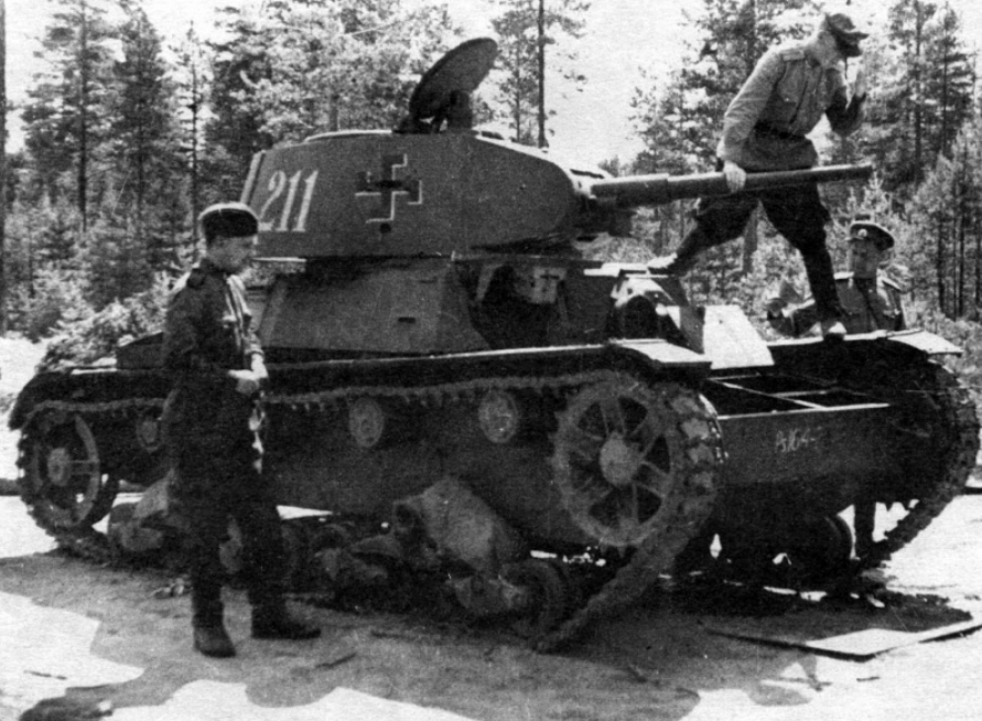 The Finns captured and evacuated nearly 70 T-26 tanks of different models (including KhT-26 and KhT-130 flame-throwing tanks) during the Winter War. Of these, 10 T-26 mod. 1931, 20 T-26 mod. 1933, 2 T-26 mod. 1938/1939, 2 KhT-26 and 4 KhT-130 were repaired at the Varkaus Tank Workshop and put into service until June 1941. The Finns also rearmed their Vickers 6-Ton tanks with the Soviet 45 mm 20K gun and the coaxial DT tank machine gun for ammunition standardization with captured T-26s. These modified Vickers tanks under designator T-26E were used by the Finnish Army during the Continuation War for infantry support.[61]