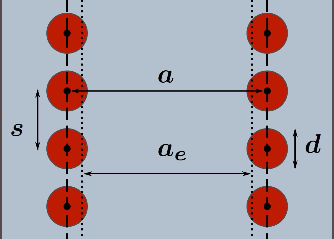 One of the objectives of the SIW geometry is to reproduce the characteristic propagation modes of rectangular waveguides inside a thin template. The width [math]\displaystyle{ a }[/math] of the waveguide is an essential parameter of those modes. In the typical SIW geometry, [math]\displaystyle{ a }[/math] is the distance between the two vias rows from center-to-center (see figure). Due to the vias geometry, this distance cannot be utilized directly; because of the space between successive vias and their circular shape, the signal inside the guide does not behave exactly as it would in a perfectly rectangular waveguide of the same width.