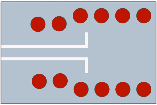 Because the vertical walls of the SIW are not continuous, radiation leakages may flow between the vias. These leakages can significantly affect the global transmission quality if the vias geometry is not chosen carefully. Some studies have been conducted to describe, predict and reduce the radiation losses. They have resulted in some simple geometric rules that have to be satisfied in order to reduce the radiation losses.[3][4][14][16][17]