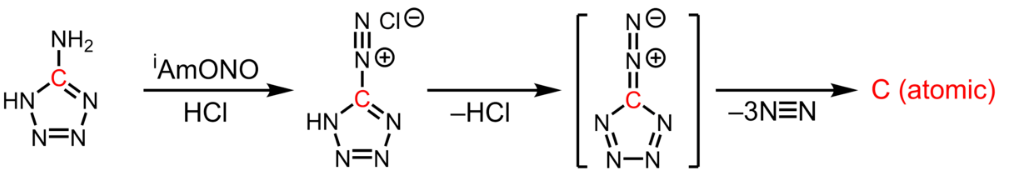 Atomic carbon is generated in the thermolysis of 5-diazotetrazole upon extrusion of 3 equivalents of dinitrogen:[3]