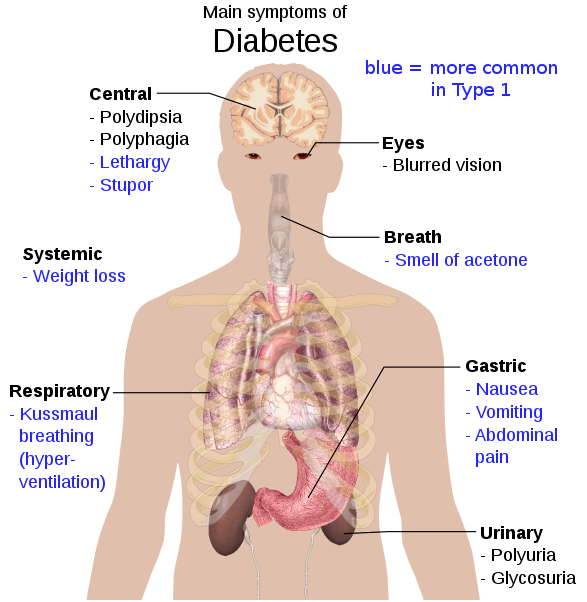 The classic symptoms of diabetes are polyuria (frequent urination), polydipsia (increased thirst), polyphagia (increased hunger), and weight loss.[1] Other symptoms that are commonly present at diagnosis include a history of blurred vision, itchiness, peripheral neuropathy, recurrent vaginal infections, and fatigue.[2] Many people, however, have no symptoms during the first few years and are diagnosed on routine testing.[2] A small number of people with type 2 diabetes mellitus can develop a hyperosmolar hyperglycemic state (a condition of very high blood sugar associated with a decreased level of consciousness and low blood pressure).[2]