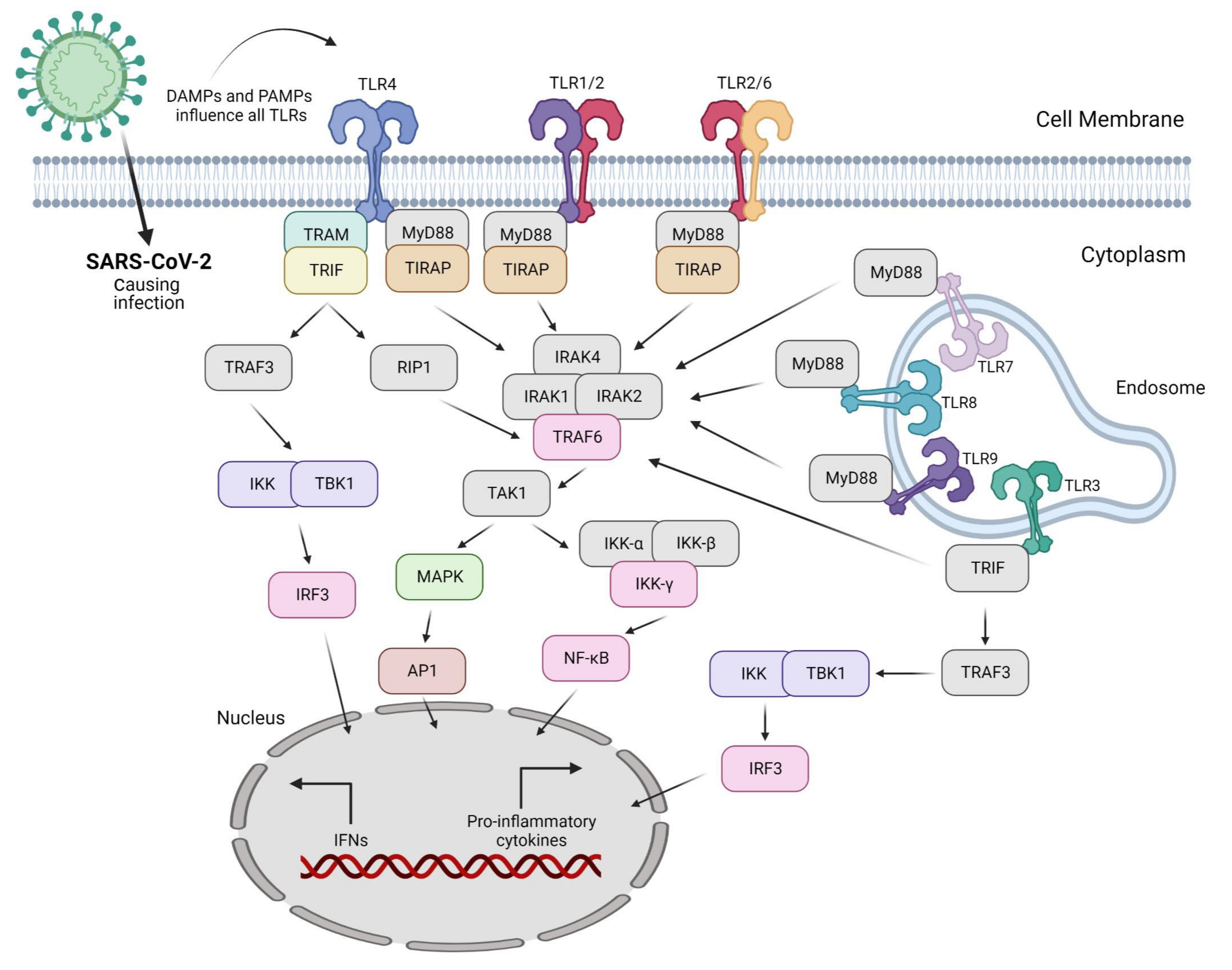 The innate immune system facilitates defense mechanisms against pathogen invasion and cell damage. Toll-like receptors (TLRs) assist in the activation of the innate immune system by binding to pathogenic ligands. This leads to the generation of intracellular signaling cascades including the biosynthesis of molecular mediators. TLRs on cell membranes are adept at recognizing viral components. Viruses can modulate the innate immune response with the help of proteins and RNAs that downregulate or upregulate the expression of various TLRs. In the case of COVID-19, molecular modulators such as type 1 interferons interfere with signaling pathways in the host cells, leading to an inflammatory response. Coronaviruses are responsible for an enhanced immune signature of inflammatory chemokines and cytokines. TLRs have been employed as therapeutic agents in viral infections as numerous antiviral Food and Drug Administration-approved drugs are TLR agonists.