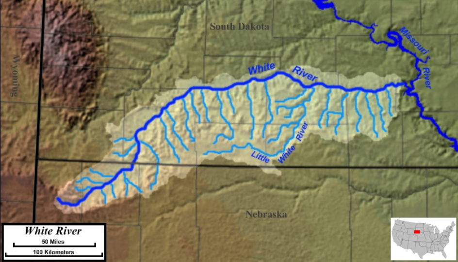 The White River flows through the reservation. It was named for the water's white-gray color, a result of eroded sand, clay, and volcanic ash carried by the river.[111] Draining a basin of about 10,200 square miles (26,000 km2), the stream flows through a region of sparsely populated hills, plateaus, and badlands.[112] It flows west to east through the reservation.