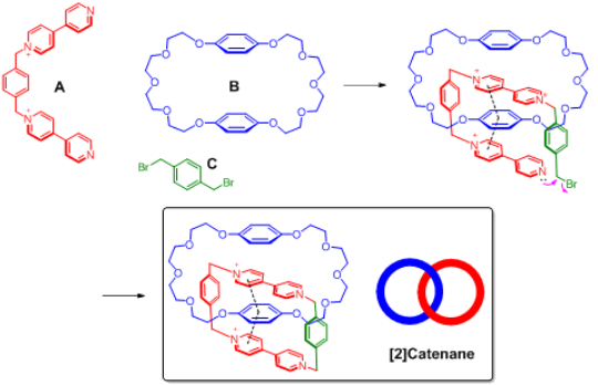 π systems are important building blocks in supramolecular assembly because of their versatile noncovalent interactions with various functional groups. A notable example of applying π–π interactions in supramolecular assembly is the synthesis of catenane. The major challenge for the synthesis of catenane is to interlock molecules in a controlled fashion. Stoddart and co-workers developed a series of systems utilizing the strong π–π interactions between electron-rich benzene derivatives and electron-poor pyridinium rings.[22] [2]Catanene was synthesized by reacting bis(pyridinium) (A), bisparaphenylene-34-crown-10 (B), and 1, 4-bis(bromomethyl)benzene (C) (Fig. 2). The π–π interaction between A and B directed the formation of an interlocked template intermediate that was further cyclized by substitution reaction with compound C to generate the [2]catenane product.