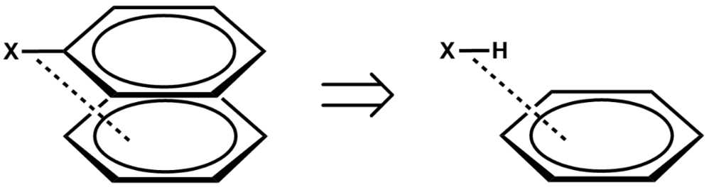Houk and Wheeler also provide compelling computational evidence for the importance of direct interaction in pi stacking.[14] In their analysis of substituted benzene dimers in a sandwich conformation, they were able to recapitulate their findings using an exceedingly simple model where the substituted benzene, Ph–X, was replaced by H–X. Remarkably, this crude model resulted in the same trend in relative interaction energies, and correlated strongly with the values calculated for Ph–X. This finding suggests that substituent effects in the benzene dimer are due to direct interaction of the substituent with the aromatic ring, and that the pi system of the substituted benzene is not involved. This latter point is expanded upon below.
