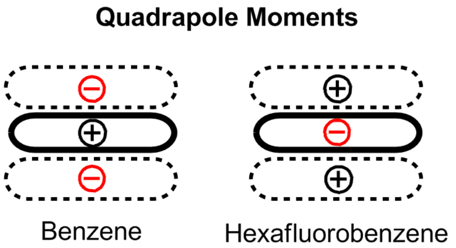 The relative binding energies of these three geometric configurations of the benzene dimer can be explained by a balance of quadrupole/quadrupole and London dispersion forces. While benzene does not have a dipole moment, it has a strong quadrupole moment.[4] The local C–H dipole means that there is positive charge on the atoms in the ring and a correspondingly negative charge representing an electron cloud above and below the ring. The quadrupole moment is reversed for hexafluorobenzene due to the electronegativity of fluorine. The benzene dimer in the sandwich configuration is stabilized by London dispersion forces but destabilized by repulsive quadrupole/quadrupole interactions. By offsetting one of the benzene rings, the parallel displaced configuration reduces these repulsive interactions and is stabilized. The large polarizability of aromatic rings lead to dispersive interactions as major contribution to stacking effects. These play a major role for interactions of nucleobases e.g. in DNA.[5] The T-shaped configuration enjoys favorable quadrupole/quadrupole interactions, as the positive quadrupole of one benzene ring interacts with the negative quadrupole of the other. The benzene rings are furthest apart in this configuration, so the favorable quadrupole/quadrupole interactions evidently compensate for diminished dispersion forces.